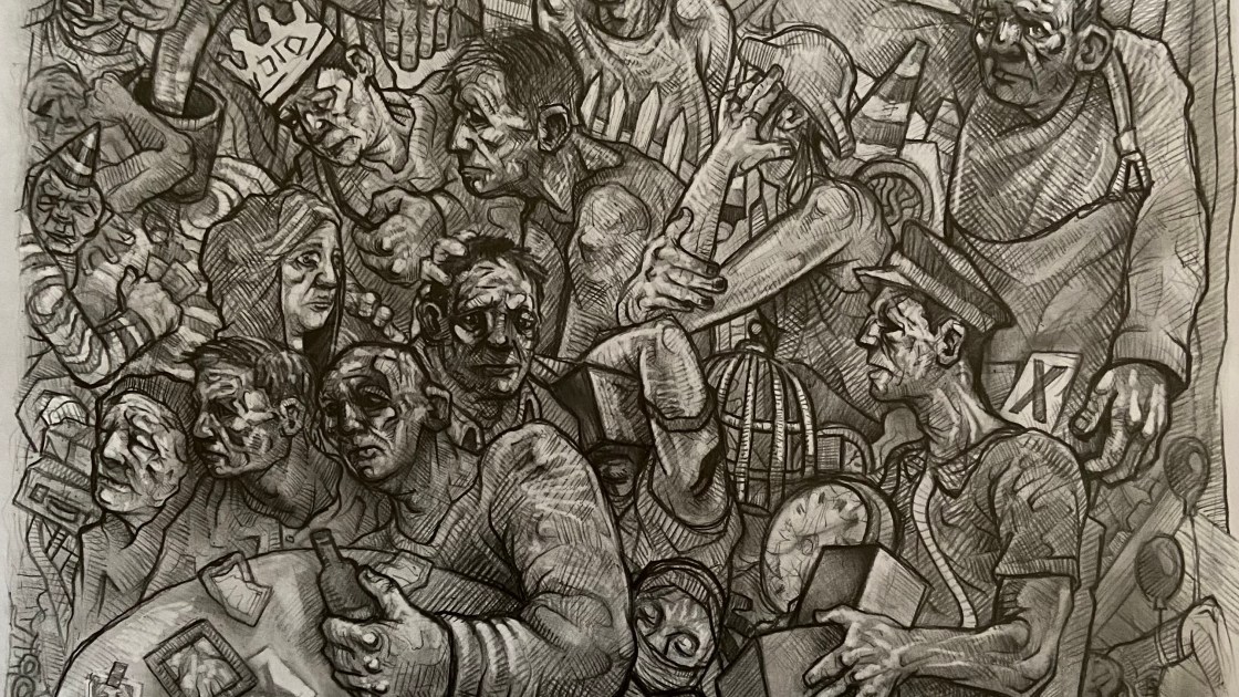 My practice predominantly utilises narrative, figurative painting, with elements of allegory, as a form of socio-political commentary. Utilising a powerful and distinctive style, I aim to invite debate about the politics of the recent past and present; whilst retaining a sense of ambiguity that ultimately keeps people searching when they’ve finished looking.
